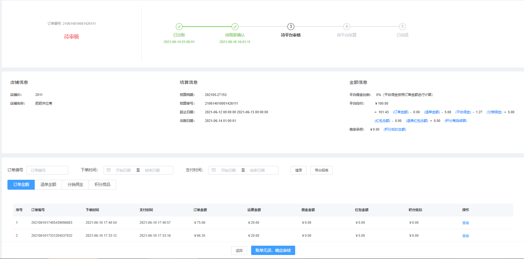 审核账单:查看-账单无误,确认审核