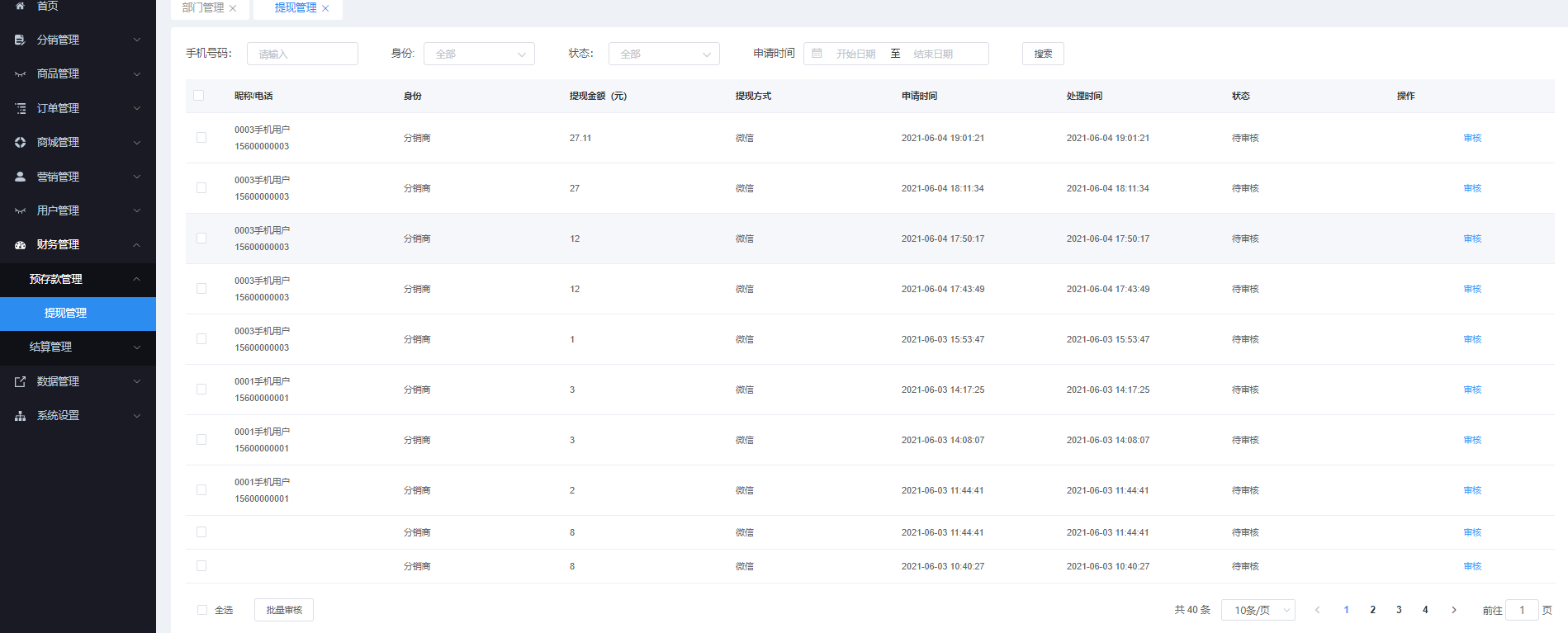 管理所有审核提现的信息,可通过手机号码、身份、状态、申请时间进行搜索。可对申请提现信息进行审核