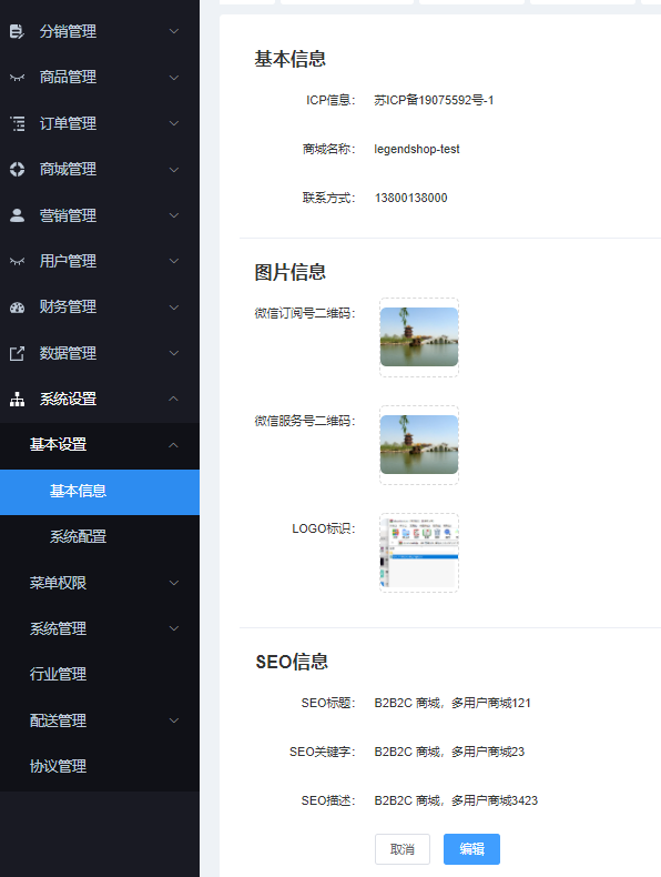 修改ICP信息、商场名称、联系方式、 微信订阅二维码、微信服务号、logo标识、SEO标题、SEO关键字、SEO描述等基本信息