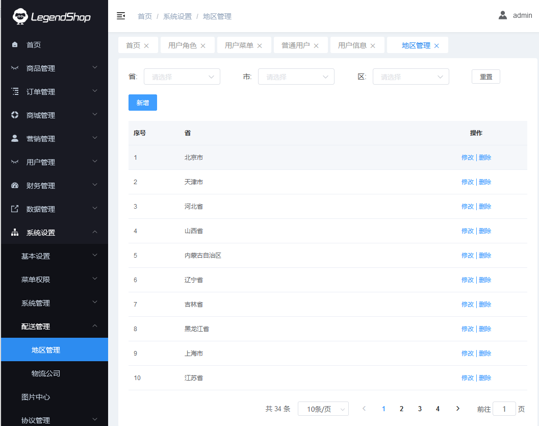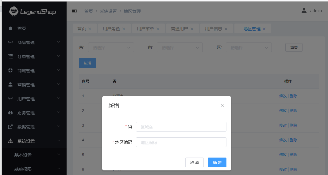 改页面管理所有的地区,并能新增、修改、删除地区