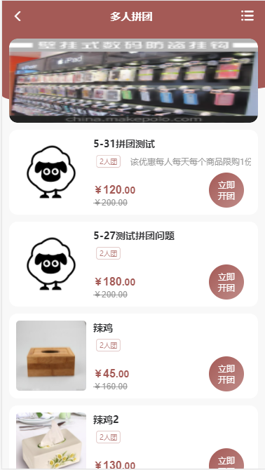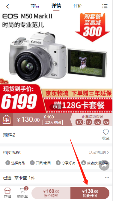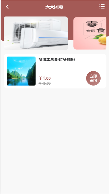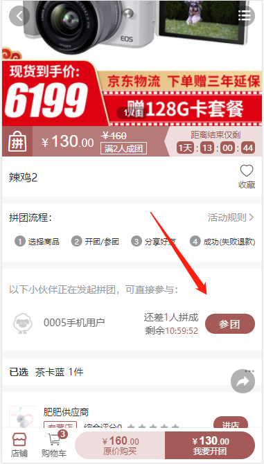 动作:首页-团购-进入“团购”列表页面-选择“团购”活动-参团-立即参团-提交订单-确认支付
