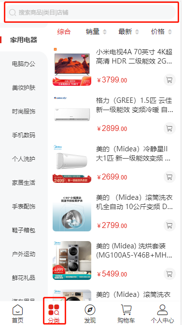进入分类页,这里会展示商品的分类和品牌的分类,一共有三级分类,每一级都对应着细分的商品。下图所示: