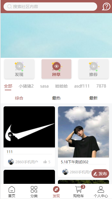 发现页,这里有发现文章和种草社区;可以通过搜索、排序方式来找到指定的文章,种草还可以发布自己种草文章。