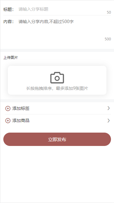 -输入“标题”-编辑“内容”-上传图片-添加标签-添加商品-立即发布