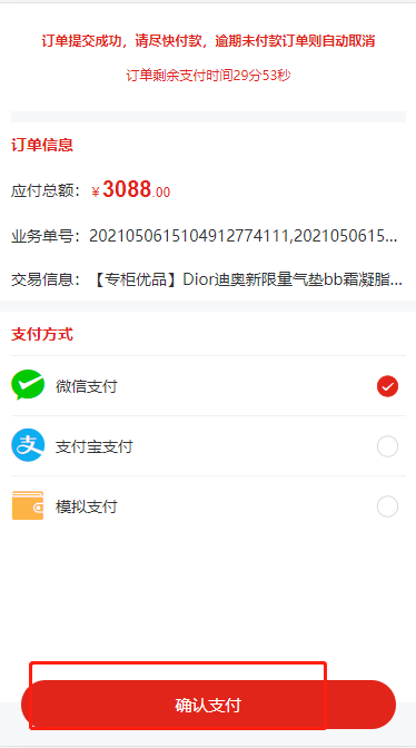 点击提交订单后跳转到支付页,支付方式支付宝、微信;