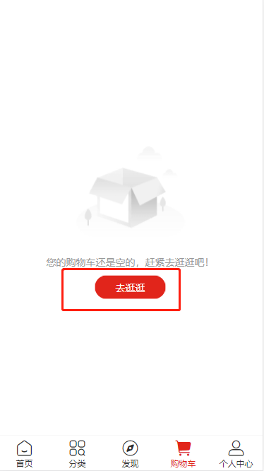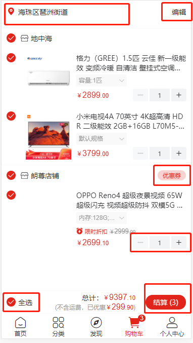 进入购物车页,如果这里没有商品会提示用户“去逛逛”把商品加入到购物车,有商品在购物车会有配送地址(可切换)、编辑、去领券、修改sku(商品规格)、修改数量、全选和结算。下图所示: