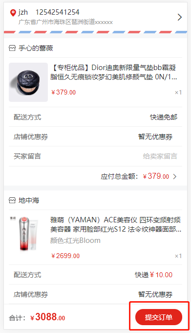 点击结算后跳转到订单页;这里会显示商品的信息、选择收货地址、配送方式、发票信息、使用的优惠券红包、买家留言、订单总价格、提交订单。下图所示: