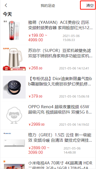 进入足迹页,这里显示历史查看过的商品详情,也可以清空浏览足迹。