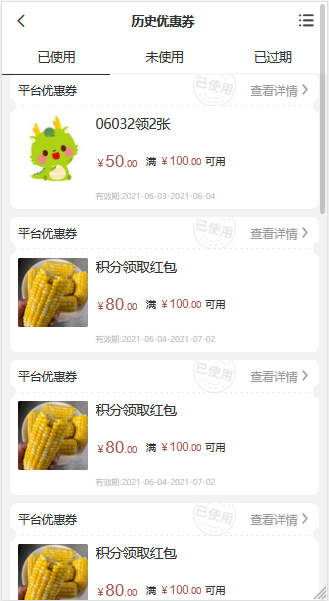 1)查看历史记录,进入历史优惠券页面,这里显示已使用、未使用、已过期的优惠券。如下图