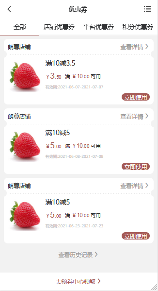 进入优惠券页,这里会显示可用的全部、店铺优惠券、平台优惠券。可以点击查看历史记录,去领券中心领取。