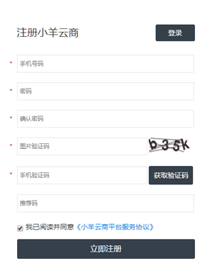 提示手机账号已经注册,说明您已经注册了小羊云商的账号,您可以通过“忘记密码”功能找回密码,或者重新换一个手机号注册;