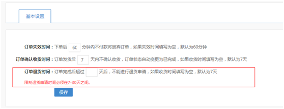(1) 在选择的退货时间限制的时候,我们默认的是订单完成的后7天。商家可以自己通过设置调整时间。功能路径:系统-通用设置-订单设置